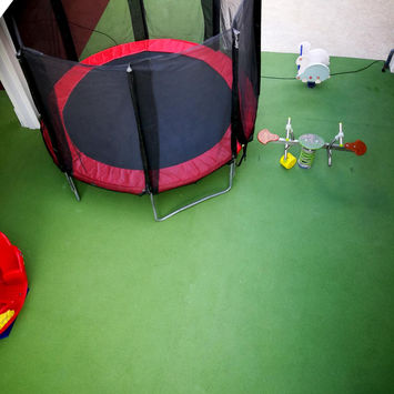 Complete refurbishment and remodeling of the outdoor playground, the old flooring slabs were replaced by cast UniPlay 40 in two colors. The thickness of the system was determined by the polygon of the yard. 25mm black SBR and 15mm green / blue EPDM were applied. All materials used are European origin REACH certified.